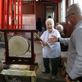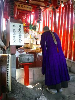 次の日、天気の良い朝に再度お会いしたお袖さんは清々しく、昨晩とはまた違った雰囲気でした。たまたま、朝のお参りをされていた信者の方といろいろお話をすることができました。その信者の方にテレビで紹介されていた、現在、お袖さんを守っている田中喜子さんについてお聞きすると、喜子さんはご高齢のため毎日は来られないけれど、月に1回行われる月並祭には必ず参加される…とのことでした。