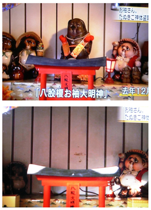 平成23年11月25日の朝…、女性信者が八股榎お袖大明神を訪れたところ、祠の中心に祀られていた「狸の神像」が無くなっているのを発見しました。警察に届出をして窃盗容疑事件として捜査をしますが、行方知れず…。世話人である田中喜子さんは心労を重ね、何日か体調を崩されました。それでも大騒動にしたくはありませんでした。 しかしこの事件は、新聞や夕方のテレビニュースでも放映されました。信者の方々は「お狸さんのことだから何日かすれば帰ってくる」と信じていましたが、警察や関係者による捜索も空しく「狸の神像」は出てきませんでした。 ★愛媛新聞 平成23年11月26日号掲載記事PDFはこちら★ |