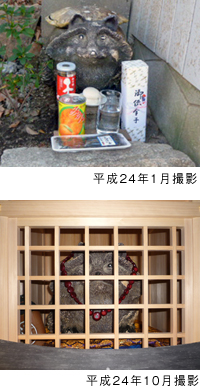 左の写真はまだ身の振り方が決まっていない新しい狸像。祠には入れてもらえていませんが一応お供え物が供えてあります。そしてこの後、世話人の田中喜子さんが代表して狸像と協議をした結果(!)、新たな「狸の神像」として迎えられたのです。